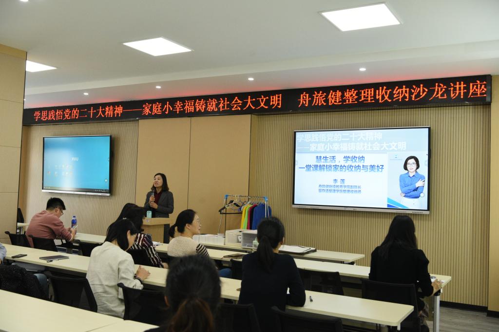 为学思践悟党的二十大精神——家庭“小”幸福铸就社会“大”文明,10月21日下午,校妇联联合校工会举办了《慧生活,学收纳——一堂课解锁家的收纳与美好》整理收纳培训讲座。讲座由校妇联主席刘杨主持,继续教育学院副院长李莲主讲。