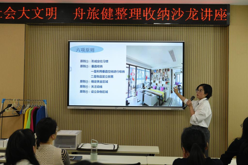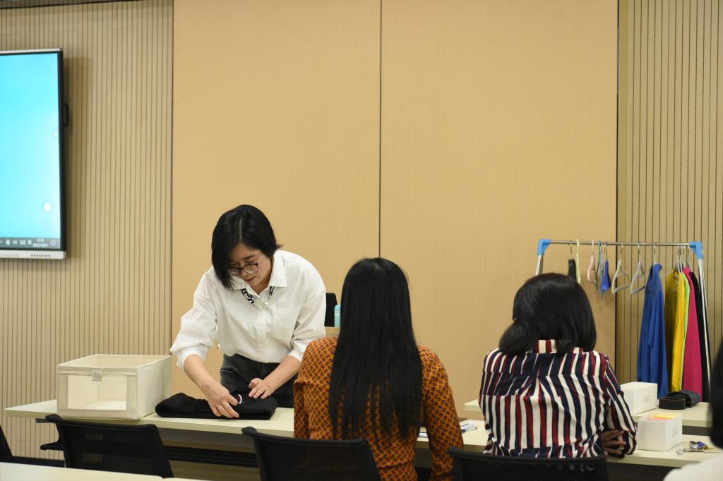李院长首先对整理收纳遵循的基本原则和实施步骤做了详尽的讲解。她提到,整理是件快乐的事情,从整理环境学会梳理内心所需,表达内心所想,让品质生活从内心走进现实。讲座中李院长重点介绍了衣柜的收纳技巧,推荐了实用的收纳工具,并对大家在日常整理中遇到的问题进行了互动交流,最后还就衣物的收纳折叠进行了现场教学。