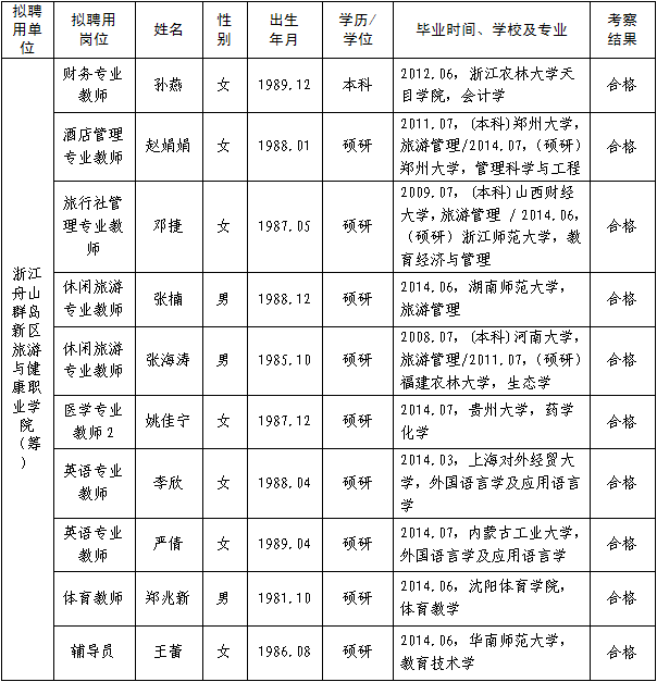 根据《2014年上半年浙江舟山群岛新区旅游与健康职业学院(筹)公开招聘人员公告》(2014年第14号)规定,经过考试、体检、考察等程序,拟聘用孙燕等10位同志为浙江舟山群岛新区旅游与健康职业学院(筹)工作人员(具体名单如下),现予公示,公示时间:2014年9月1日―9月10日(7个工作日)。