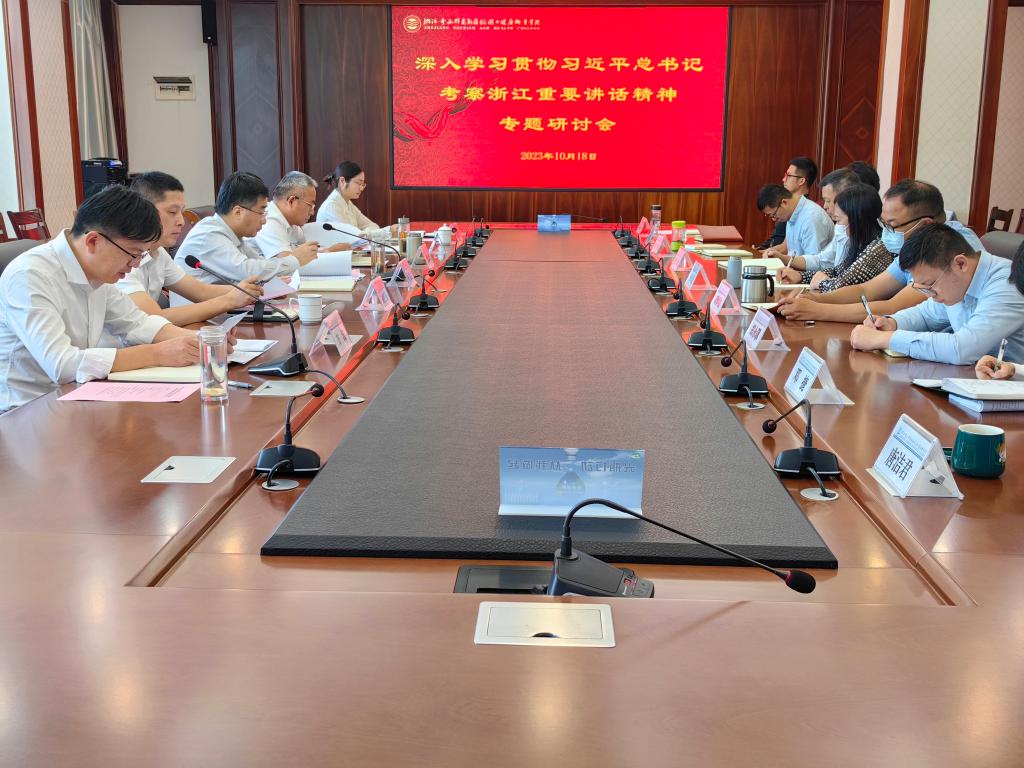 为深入学习贯彻习近平总书记考察浙江重要讲话精神,引导带动全校进一步用习近平总书记重要讲话精神统一思想、统一意志、统一行动,根据省委、市委主题教育部署要求和学校工作安排,10月18日上午,学校召开“深入学习贯彻习近平总书记考察浙江重要讲话精神”专题研讨会。学校党委班子成员,学校主题教育领导小组成员参加会议。省委主题教育第九巡回督导组成员朱红征,市委主题教育办相关同志列席会议。学校党委书记姚奇富主持会议并讲话。