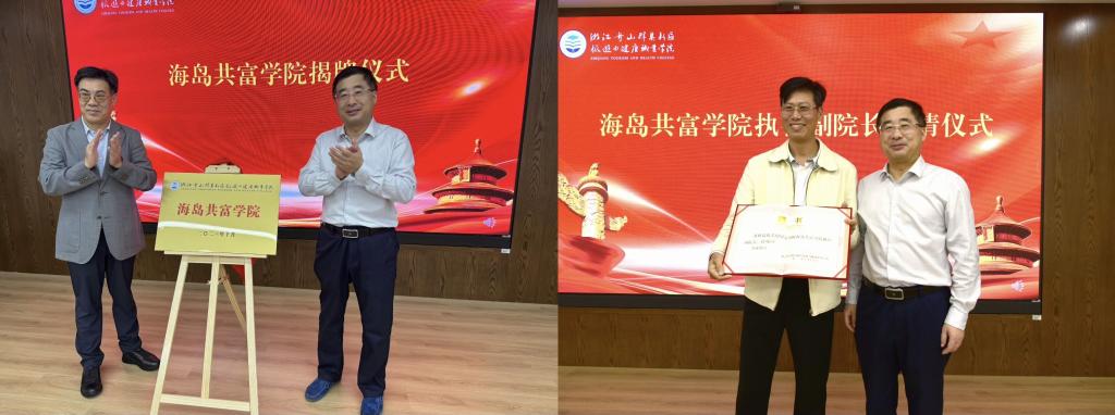 孔志华介绍了海岛共富学院的建设目标、行动计划和发展构想。海岛共富学院立足舟山,以海岛共同富裕为主题,以海岛乡村振兴为主线,以小岛为主要载体,实施相关行动计划,搭建工作平台,强化共富理念和实践本领,旨在将海岛共富学院建设成服务海岛乡村振兴的开放型、实践型、服务型产教融合共同体,探索构建多元开放融合的海岛地区高职办学格局的可行路径,促进舟山各小岛经济社会高质量发展,为海岛城市打造市域产教联合体。在成立仪式上,姚奇富书记和钱军主任共同为海岛共富学院揭牌。随后,姚书记向陈爱国颁发聘书,聘请其担任海岛共富学院执行副院长。